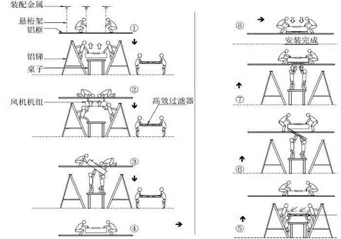 FFU安裝步驟一.準(zhǔn)備好安裝時(shí)所需要使用到的工具,按圖所示,兩個(gè)安裝人員事先登上天花板,打好裝配金屬,腳踏龍骨,雙手扶住懸桁架;兩位安裝人員把FFU平放在桌子上,而高效過濾器事先放在一旁。