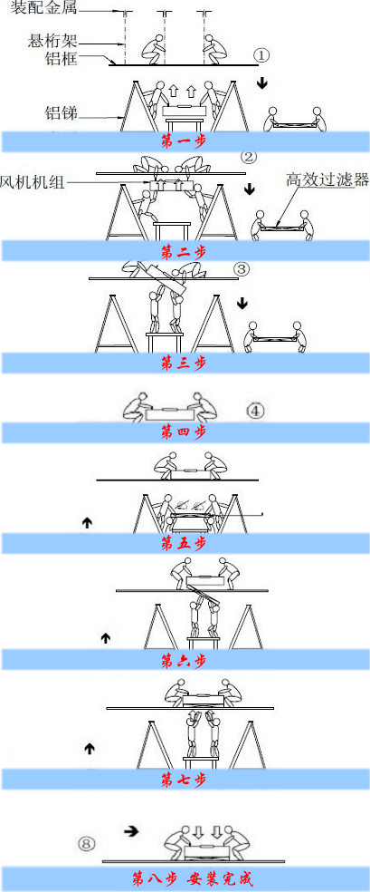 準備好安裝時所需要使用到的工具,按下圖所示,兩個安裝人員事先登上天花板,打好裝配金屬,腳踏龍骨,雙手扶住懸桁架;兩位安裝人員把FFU平放在桌子上,而高效過濾器事先放在一旁。